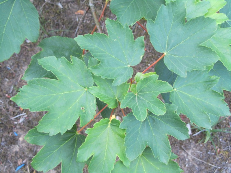 Les feuilles sont opposées, à 5 lobes ovales peu aigus, plus ou moins dentés, séparés par des sinus étroits aigus, à nervation palmée. Le pétiole est long et élargi à la base, rougeâtre.